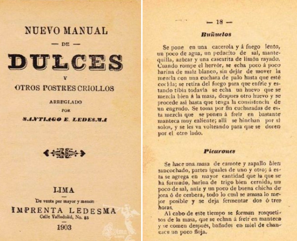The 1903 cookbook Nuevo Manual de Dulces y Otros Postres Criollos, a collection of traditional creole recipes from Lima, includes one for picarones: